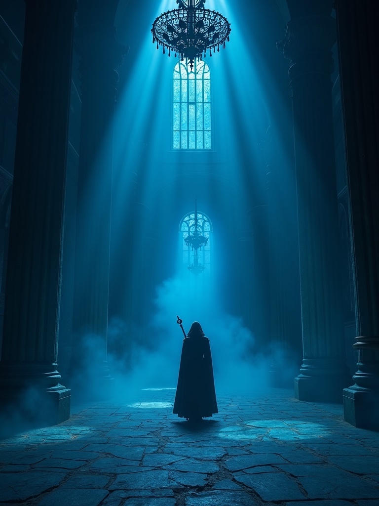 Alone warrior inside a vast ruined monastery swallowed by deep blue night, endless vaulted halls, cracked marble floors, massive iron chandeliers hanging in darkness, cold sapphire light pouring through broken windows, drifting ash and fog, ancient relics, chained doors, gothic nightmare atmosphere, supernatural tension, cinematic composition, ultra detailed, realistic, dark and intense, 8k