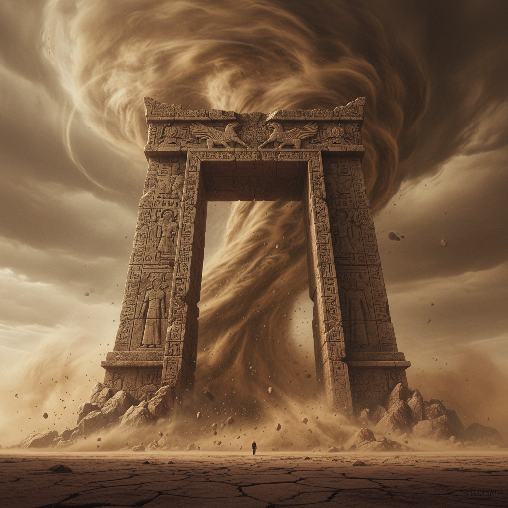 A monumental stone gateway opening directly into a violent sepia dust cyclone, airborne sand, sacred scale, epic atmospheric realism