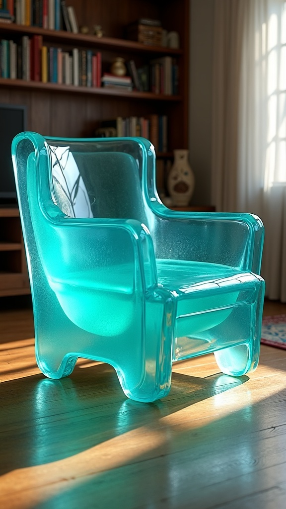 A classic mid-century armchair in a normal living room, but the entire chair is made of transparent turquoise jelly — wobbly translucent teal gelatin holding its shape, light refracting through the material casting cyan patterns on the wooden floor, the seat subtly deformed as if someone just stood up from it, the armrests slightly jiggly, bookshelves and a rug in the background perfectly normal, 8k