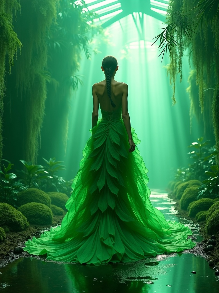 A high-fashion model walking down a runway built inside a vast living greenhouse, wearing a sculptural gown made entirely of layered emerald leaves and translucent green organza, the fabric flowing like liquid jade, the catwalk surrounded by towering tropical plants and hanging moss, green spotlight beams cutting through humid mist, reflections on the wet glass floor, editorial Vogue aesthetic, dominant green palette, no red or warm tones, no text