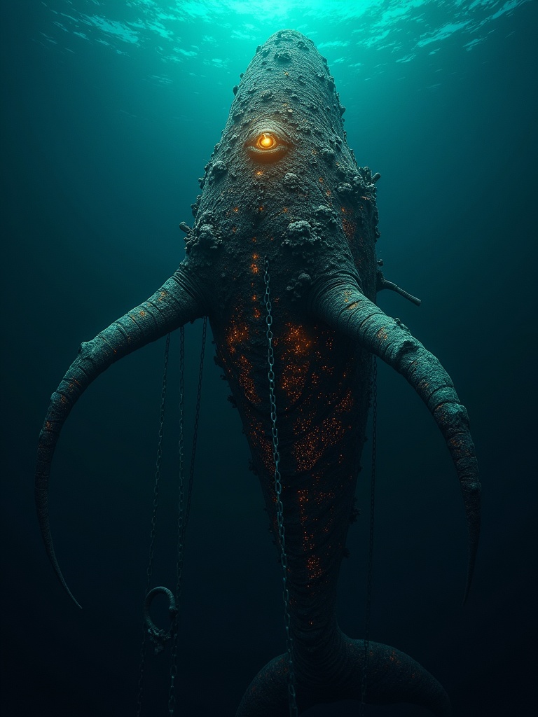 A colossal deep sea creature rising vertically from the pitch black ocean depths, its massive body covered in bioluminescent patterns glowing deep amber and burnt orange, ancient barnacles and coral growing on its scarred hide, chains and anchors from centuries of sunken ships tangled around its fins, viewed from below looking up toward the faint teal surface light far above, the creatures eye the size of a car glowing warm gold, overwhelming scale, deep ocean photography, 8k