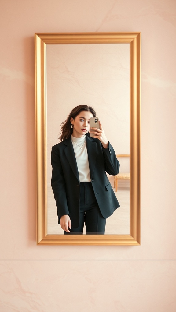 A stylish young woman taking a mirror selfie in a quiet pink marble gallery, classic pink rose reflections, minimal fashion editorial, clean hero composition