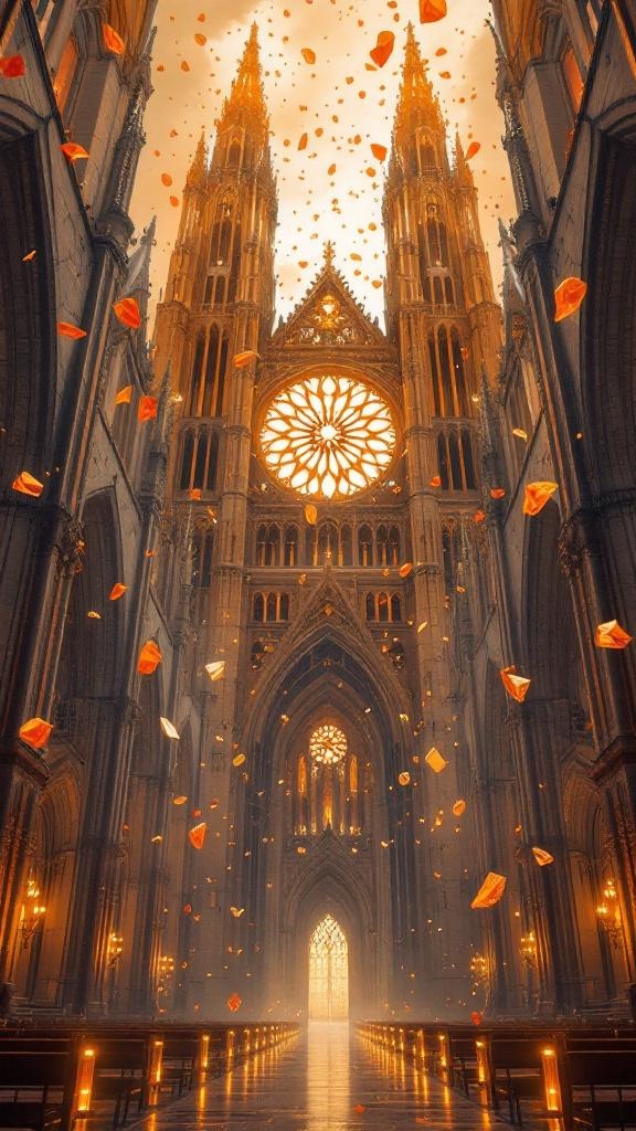 A towering Gothic cathedral built from burnt orange stone and translucent apricot glass, its rose window replaced by hundreds of floating mandarin shards orbiting in slow circles above the nave, pale incense haze, long aisles, candlelit chapels, richly layered environment, cinematic realism, ultra detailed, sharp focus, 8k