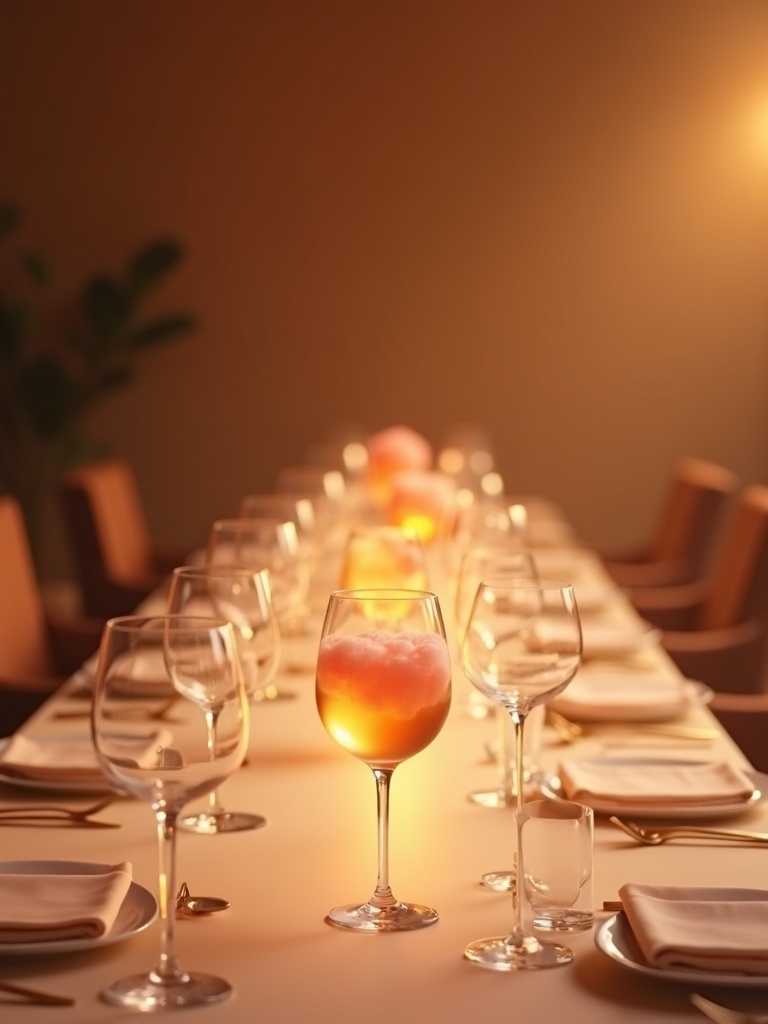 A long dining table set with empty glasses, each glass holding a suspended apricot dawn cloud, soft peach condensation, quiet ballroom atmosphere, elegant realism