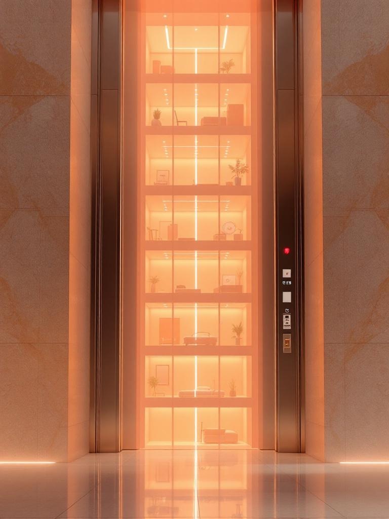 An open elevator shaft filled with stacked translucent apricot rooms instead of machinery, soft peach walls glowing from within, clean architectural surrealism, sharp focus