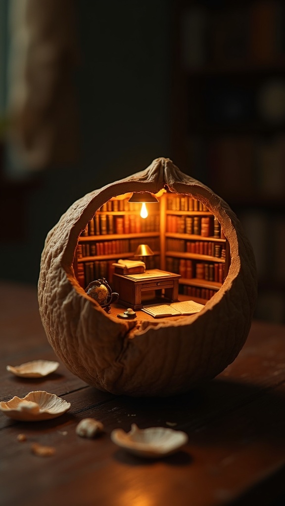 A walnut cracked open on a dark wooden desk, inside instead of the nut there is a miniature Victorian study — a tiny mahogany desk with scattered papers, a brass lamp glowing warm amber, miniature leather-bound books lining the curved shell walls like shelves, a tiny globe and magnifying glass, warm golden light spilling from the open walnut onto the table surface, scattered shell fragments beside it, macro photography, 8k