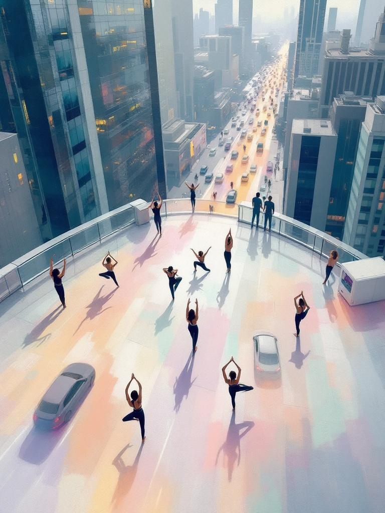 A modern urban scene in the style of Edgar Degas, people in athletic wear practicing yoga and dancing on a skyscraper rooftop, view from above with asymmetric composition, figures cropped by the edges of the frame, below a stream of cars transformed into blurred colorful streaks, color palette of pastel tones against a dark city background mint lavender and peach, light brushstrokes creating a feeling of an instant snapshot of modern life, 8k
