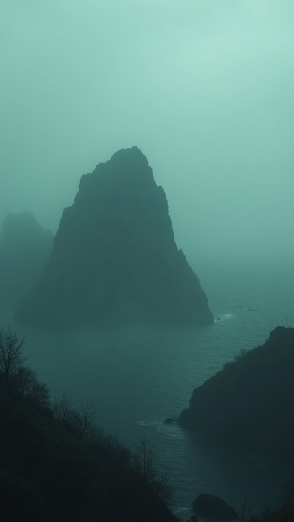Atmospheric landscape of dark rocky islands emerging from cold mist, muted green-gray palette, distant fog, quiet cinematic melancholy, painterly realism, epic negative space