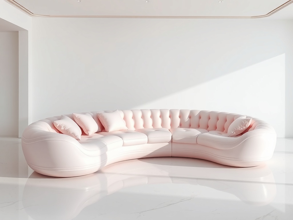 A curved living-room sofa formed from bands of pale pink gelato with a glossy frozen surface, minimal white penthouse, luxury design realism