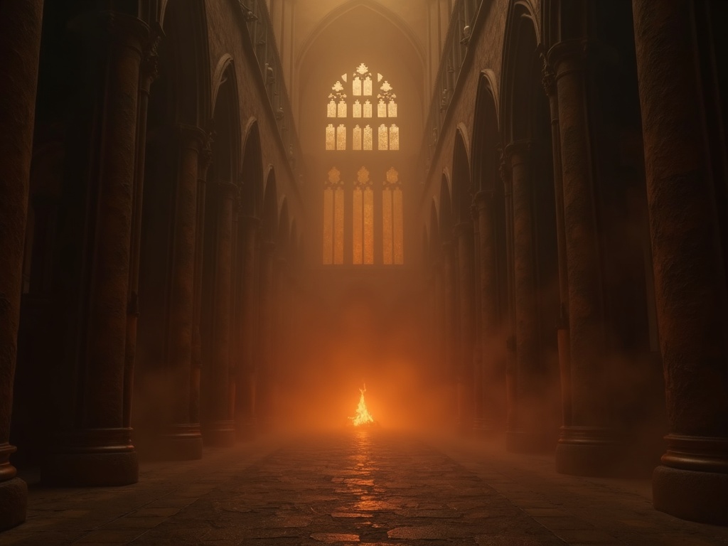 A vast gothic cathedral filled with brown smoke instead of incense, narrow windows glowing like dying embers, sacred darkness, mystical infernal realism