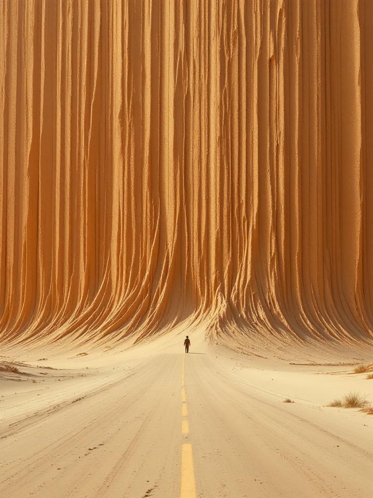 A huge vertical wall of moving brown sand crossing an empty desert road, one tiny figure beneath it, clean heroic composition
