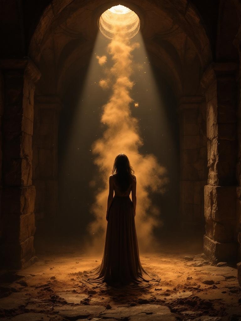 A lone woman standing in a candlelit catacomb hall, a halo of suspended brown dust behind her head, carved stone walls, dark sacred editorial energy