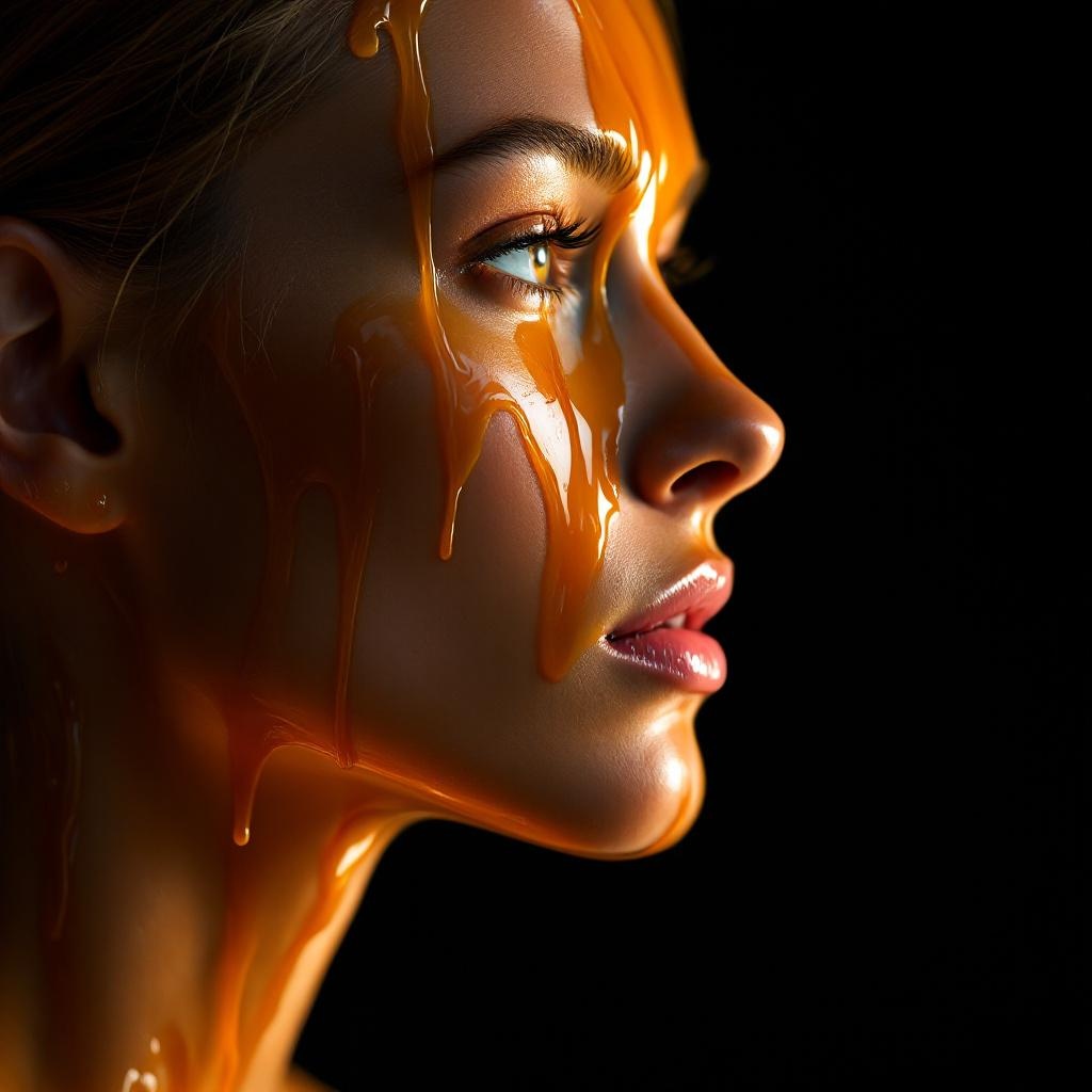 Extreme close up portrait in profile, thick liquid caramel slowly pouring over the persons face from above, viscous amber streams running from the hairline over the forehead and cheekbone, pooling in the collarbone area, thin golden threads stretching from the chin, some areas hardening into a cracked toffee shell while fresh warm caramel continues to flow in the center, natural freckled skin visible underneath in gaps, dark background, warm dramatic lighting, 8k