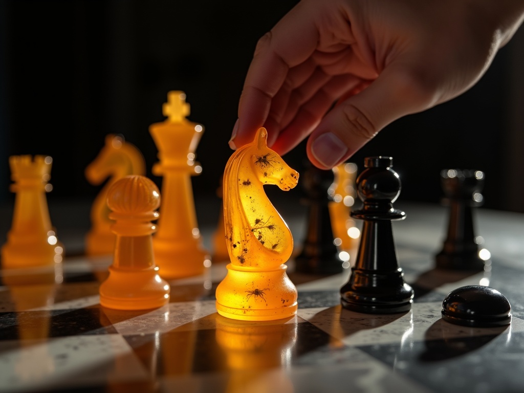 A chess set mid game on a marble table, the light pieces carved from translucent Baltic amber in warm honey orange with visible ancient insect inclusions, the dark pieces from polished black obsidian with mirror reflections, the amber queen glowing warmly under the desk lamp, a hand reaching for an amber bishop, dramatic side lighting casting long shadows, product photography, 8k