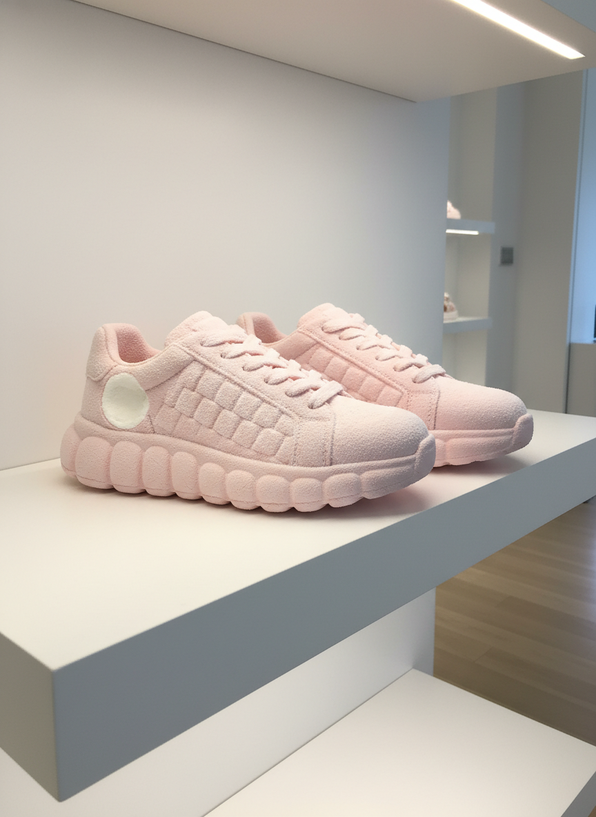 A pair of luxury sneakers displayed on a white shelf in a clean minimalist shoe store, but both shoes are made entirely of soft pink marshmallow — perfectly shaped with puffy marshmallow soles, the surface lightly dusted with powdered sugar, one shoe has a bite taken from the heel revealing the soft fluffy white interior, warm retail lighting, product photography, 8k