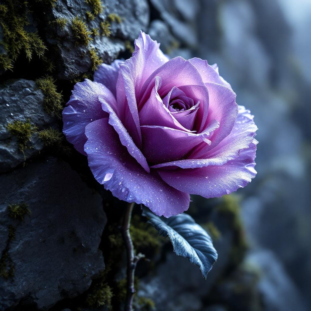 A single rose built from crystallized lavender light, layered petals with an amethyst center and a thin violet outline, black velvet background, macro photography, delicate but unreal, ultra-detailed, growing from a crack in a weathered stone wall, morning dew on surrounding moss, soft fog in the background