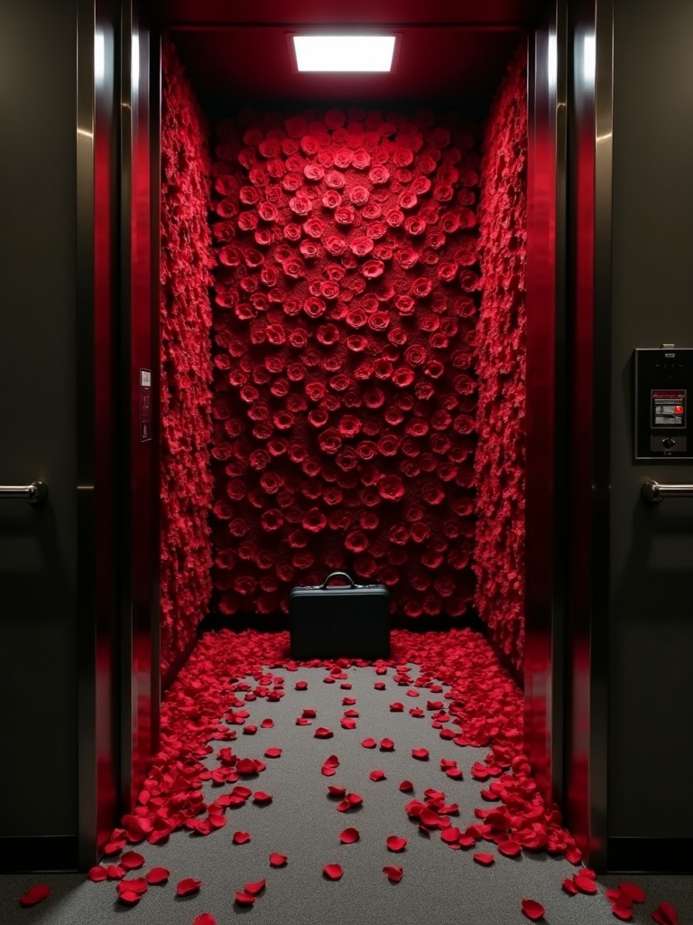 The doors of an ordinary office elevator opening to reveal the entire cabin packed floor to ceiling with deep red roses, petals spilling out onto the grey corporate carpet, fluorescent hallway lights contrasting the romantic burgundy interior, a single briefcase visible among the flowers, absurd juxtaposition, photorealistic, cinematic