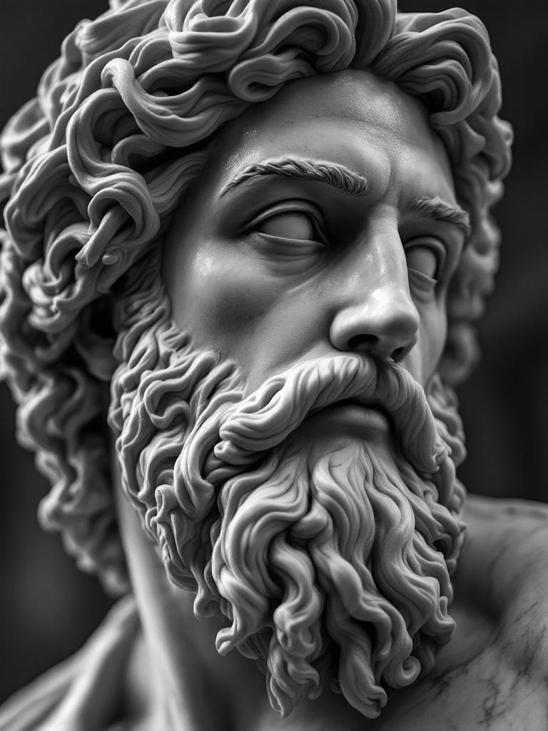 Extreme close-up of a classical marble sculpture showing carved flowing hair and beard, museum lighting, rich grayscale texture, dramatic shadow carving, fine-art stone photography