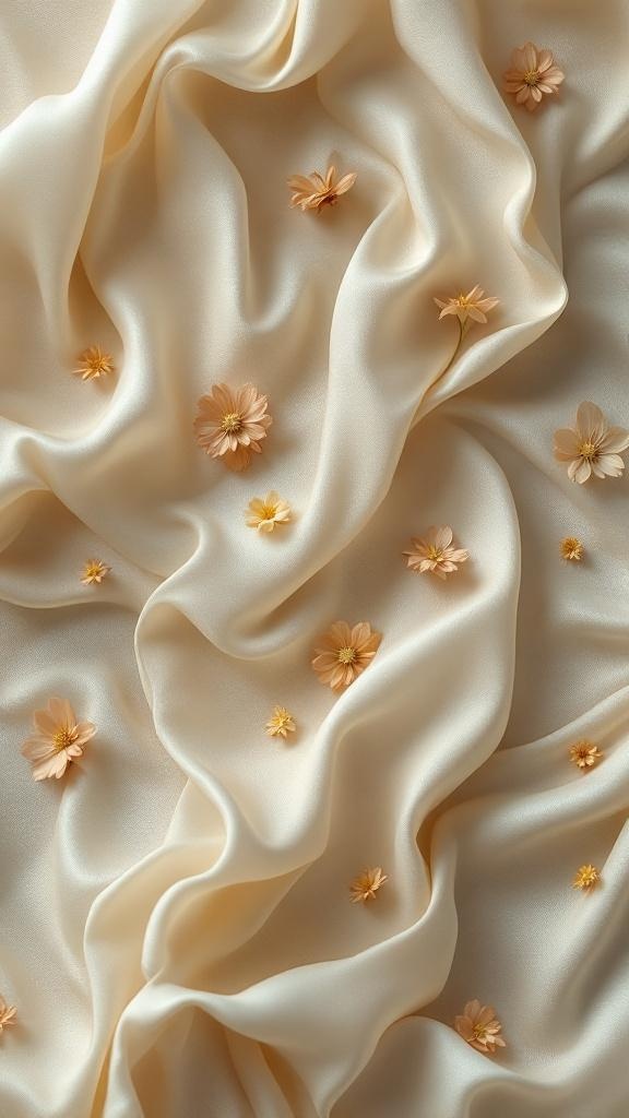 Luxury abstract composition of flowing ivory ribbons and folded silk forms with small warm flowers embedded in the surface, soft studio lighting, elegant editorial still life, premium sculptural design