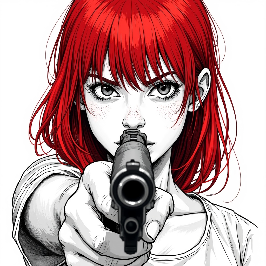 A close up of a young woman with vivid red hair pointing a handgun directly at the viewer, drawn in detailed manga ink sketch style, mostly black and white with fine crosshatching and pen lines, only her hair colored in bold red, freckles on her face, intense determined expression, the gun barrel in sharp focus in the foreground, white background, comic book illustration, 8k