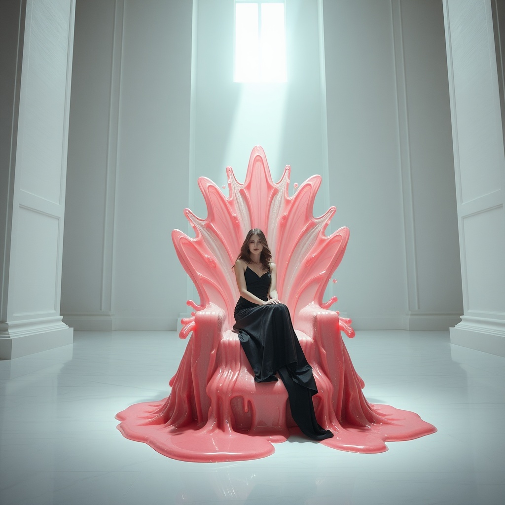 A woman sitting on a throne made of dripping liquid pink glass in an empty white cathedral, the molten rose material catching light like hot sugar, her black silk dress contrasting the translucent pink structure, single shaft of light from a high window, architectural fashion editorial, 8k