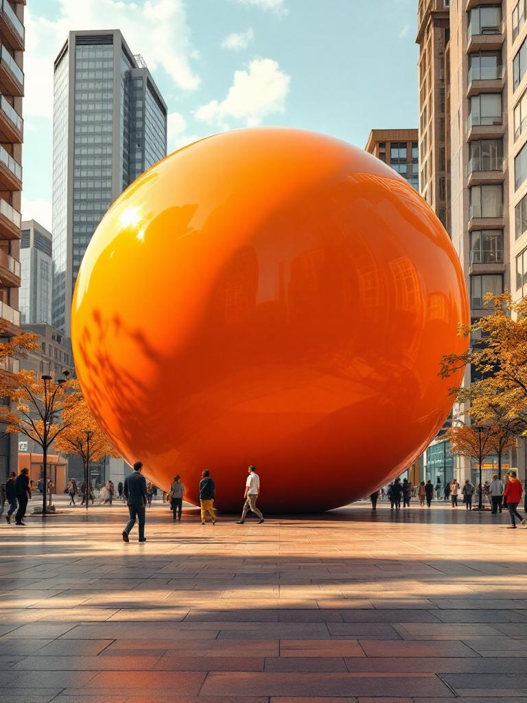 A city plaza dominated by a colossal smooth orange sphere the size of a small building, its surface shifting from light apricot at the top to soft peach-orange and natural orange near the horizon line, saturated mandarin reflections sliding over nearby windows, deep burnt orange shadow covering the paving stones beneath it, everyday urban scale broken with complete realism, cinematic, ultra-detailed