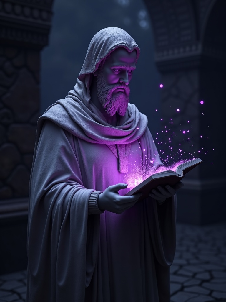 A solemn marble priest statue holding a tablet, the tablet surface erupting into violet code, lilac projection lines, and a hidden amethyst glow beneath cracked stone, silver particles floating through the darkness, moody cinematic lighting