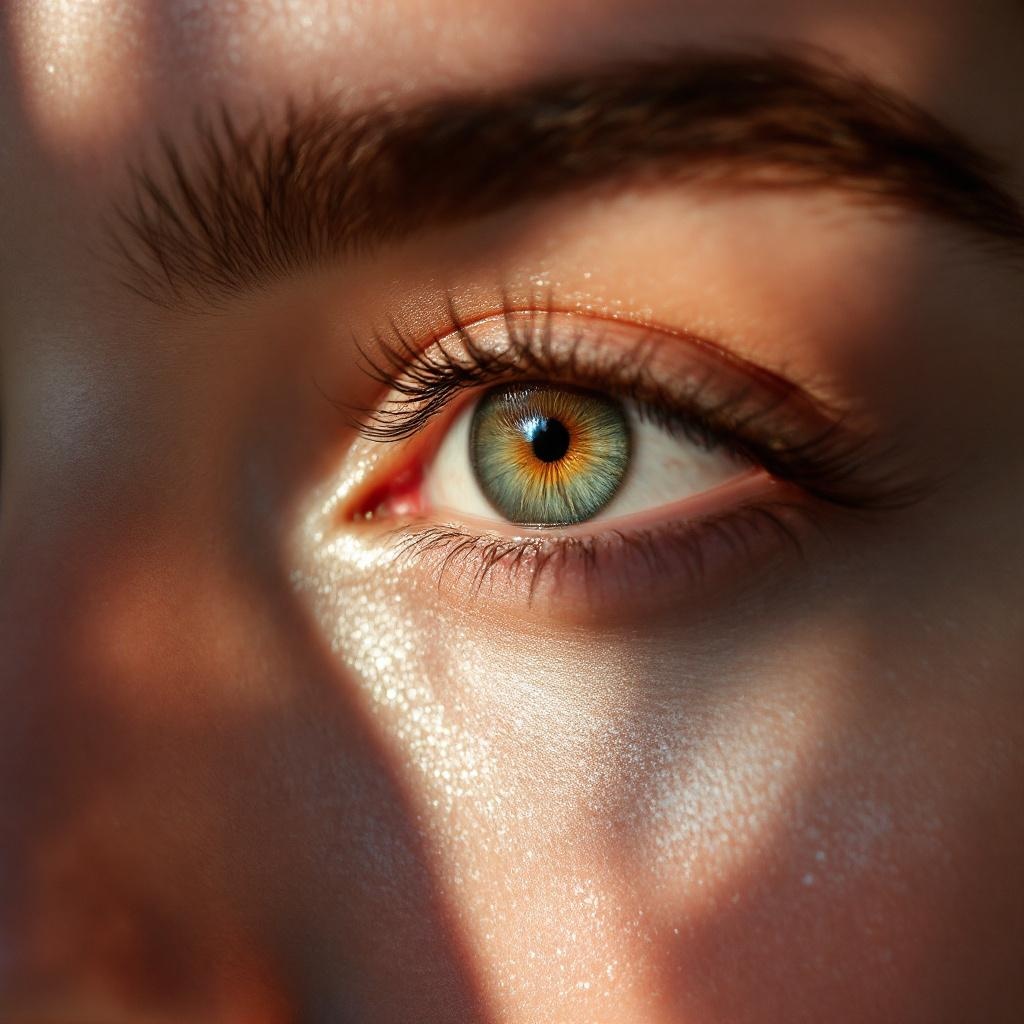 Ultra-close beauty portrait focused on one eye, glowing skin texture, subtle makeup, reflected light in the iris, editorial skincare campaign, hyper-detailed realism