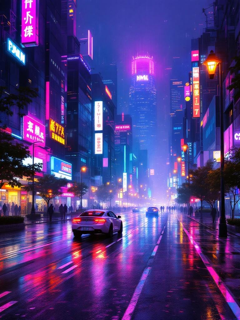 A cyberpunk cityscape painted in the style of Claude Monet: neon signs blurring into colorful light reflections, wet asphalt surface after rain mirroring everything above, silhouettes of skyscrapers in a soft haze, hovering cars leaving light trails like impressionist brushstrokes across the sky, color palette of purple electric blue neon pink and gold, soft focus throughout, atmosphere of a foggy evening, the feeling of an impressionist perception of a technological world, visible canvas texture, high resolution, 8k